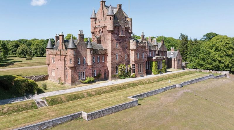 This renovated castle, constructed in 1845, boasts formal gardens featuring a narrow-gauge railway. The property showcases ornately moulded ceilings and impressive grand fireplaces. It includes 17 bedrooms, 9 bathrooms, 3 state rooms, 2 lodges, 4 estate houses, a stable yard with 3 flats, fishing rights on the Eye Water, and spans 160 acres.